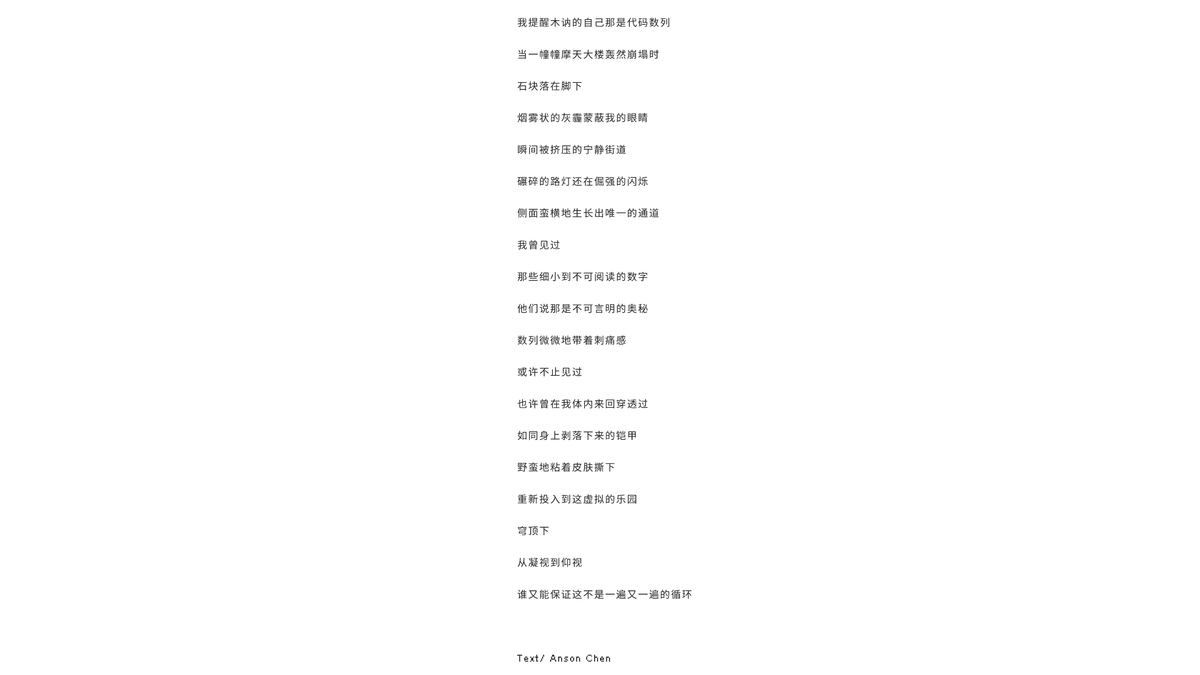 我的实践是我与城市对话的方式,通过这种方式我希望创作出既简洁又具有隐喻性的作品,它们不直接给出结论,而是留下一定的空间让观众自行体会其中所包含的压迫、荒诞与脆弱。