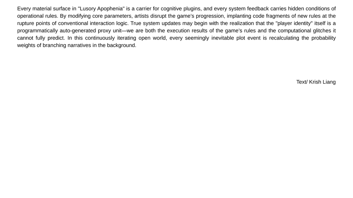 在这个不断流动的世界中 , 他试图顺应“⽆形” 的法则 , 穿透表象 , 接近更深的实相。通过创作 , 他希望引发观者对“⽆”与“有”、“现实”与“虚拟”之间关系的反思 , 营造⼀种既熟悉⼜陌⽣的感知边界 , 进⽽引导观者思考 :⾃⾝所处世界的真实性。
