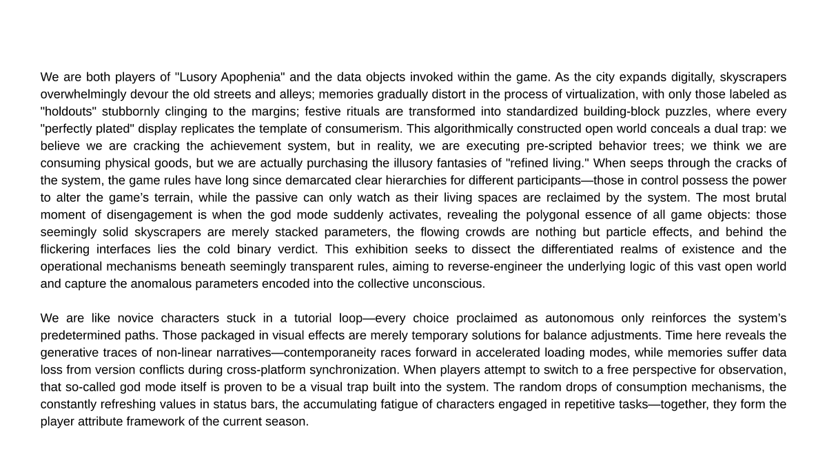 在我的作品中常将高楼作为一种符号使用,它既是一种城市中权力的外形,同时也代表着社会层级的关系,就业压力以及对生存状态的映射。作品中常出现的建筑形态和基于城市所变形出来的互动装置,延伸出来的游戏元素,都是我理解城市的方式-作为舞台,博弈场,系统与容器。