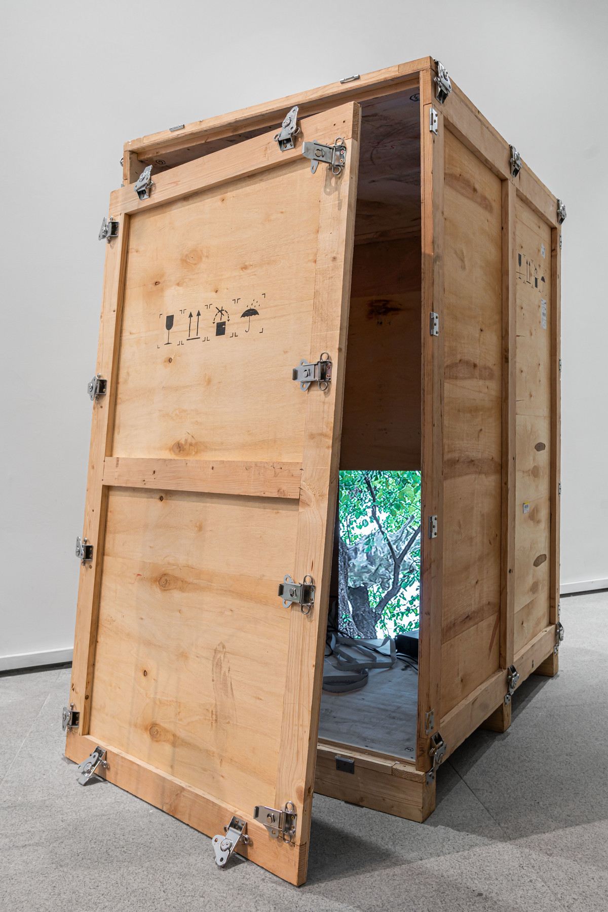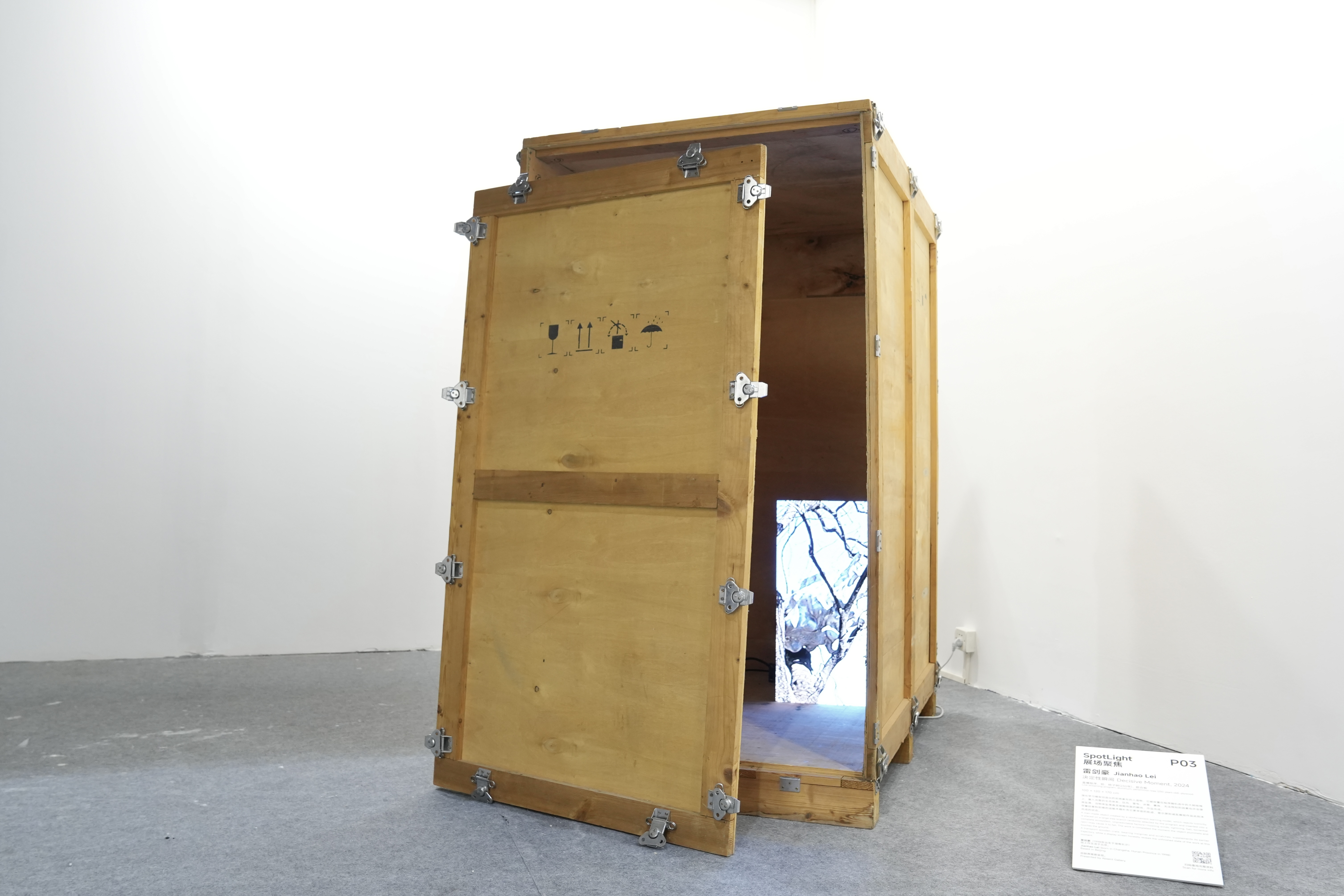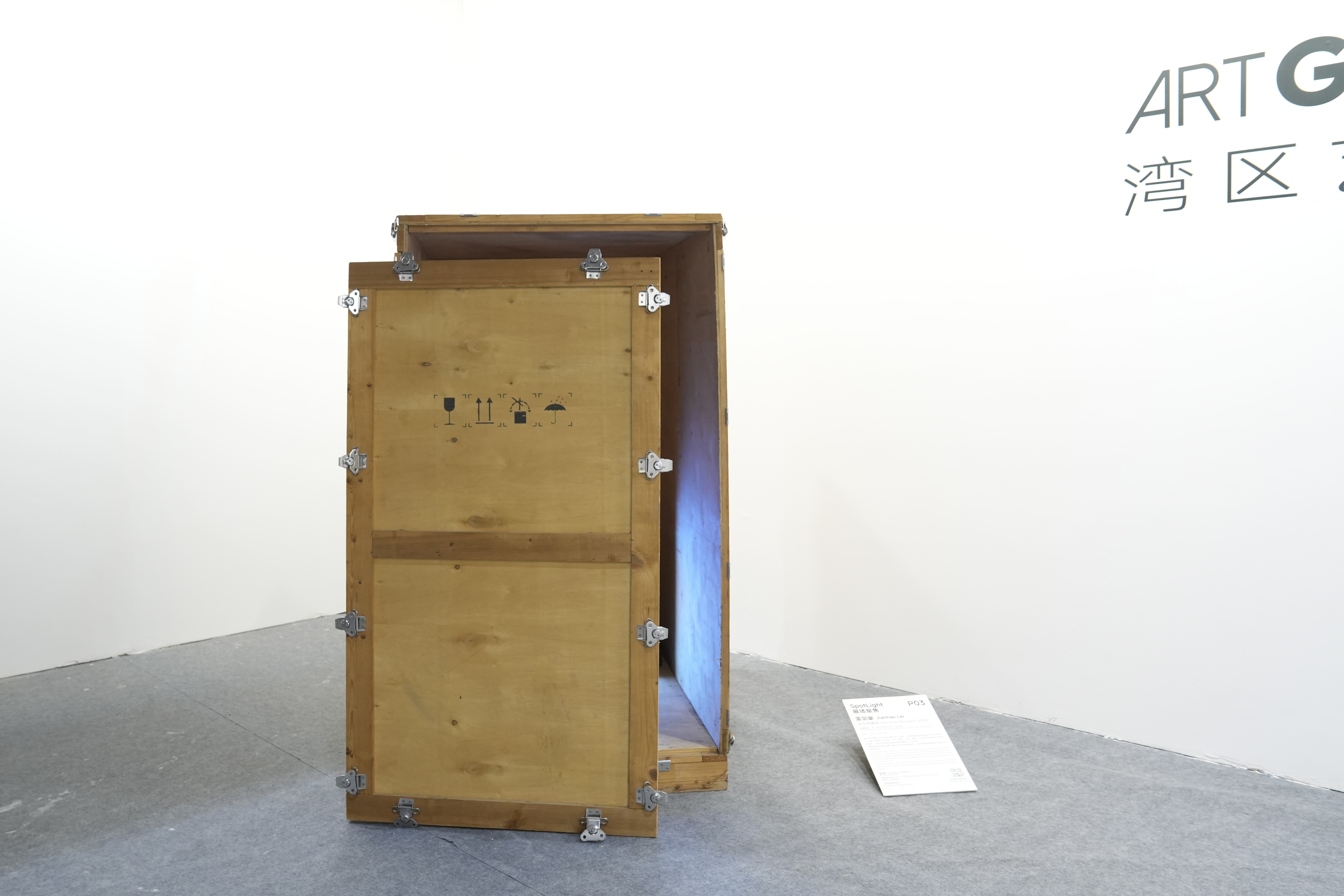 在公共空间中,带着岁月痕迹的运输木箱与实时显示作品状态的屏幕形成鲜明对话,后结构主义与后人类主义的讨论也在此展开。前者记录着人造物在抵达空间前的隐秘旅程,后者则暴露了艺术似乎永远“未完成”的真相,暗示诠释将始终悬置,直至坠地“决定性瞬间”的降临。这种双重叙事邀请我们徘徊于控制与混沌、在场与缺席、完成与溃散的张力之间。