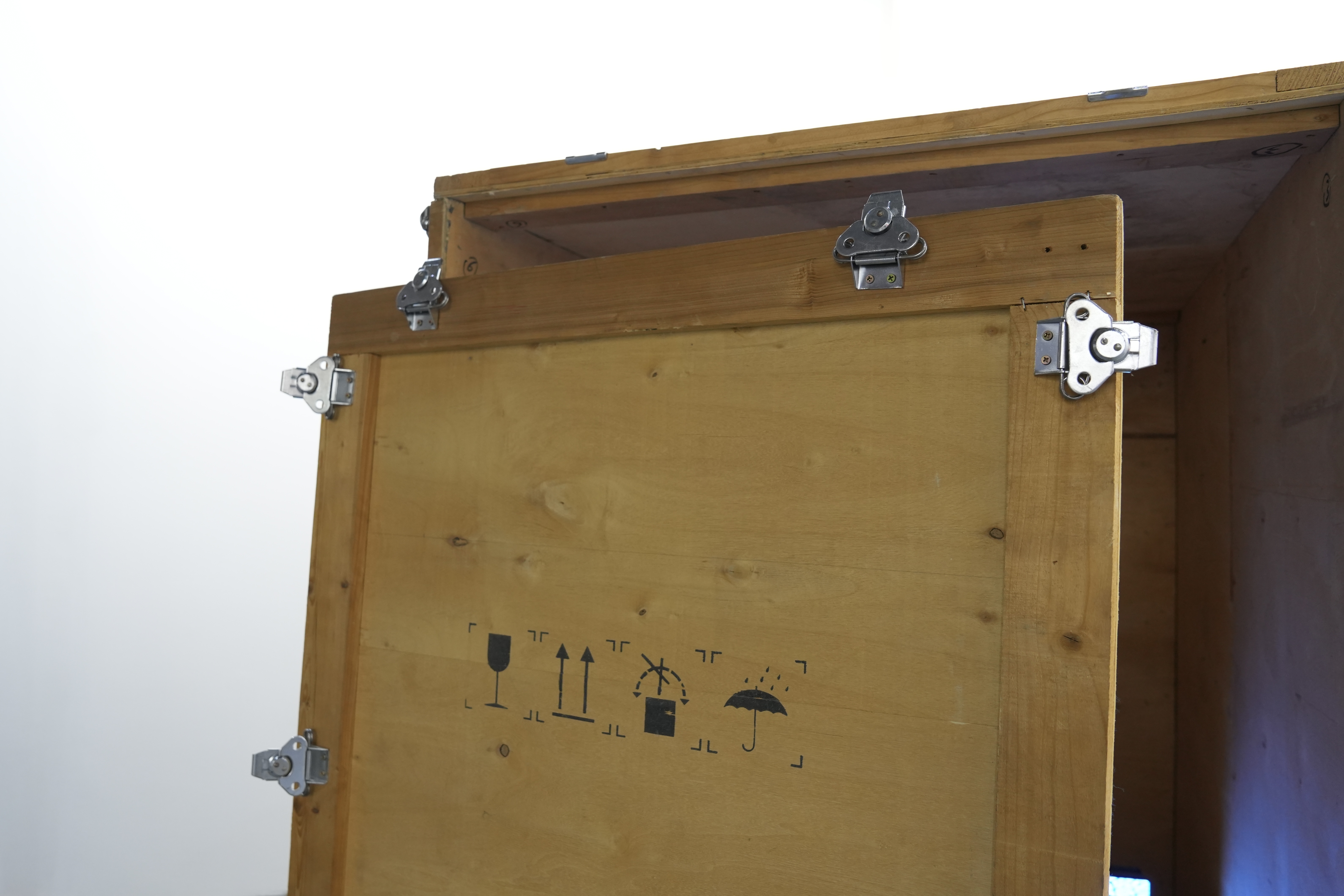 A transport wooden crate, marked with emblems and scratches, supplements its earlier trajectory, while a display screen honestly reveals the unfinished state of the work at this moment.
