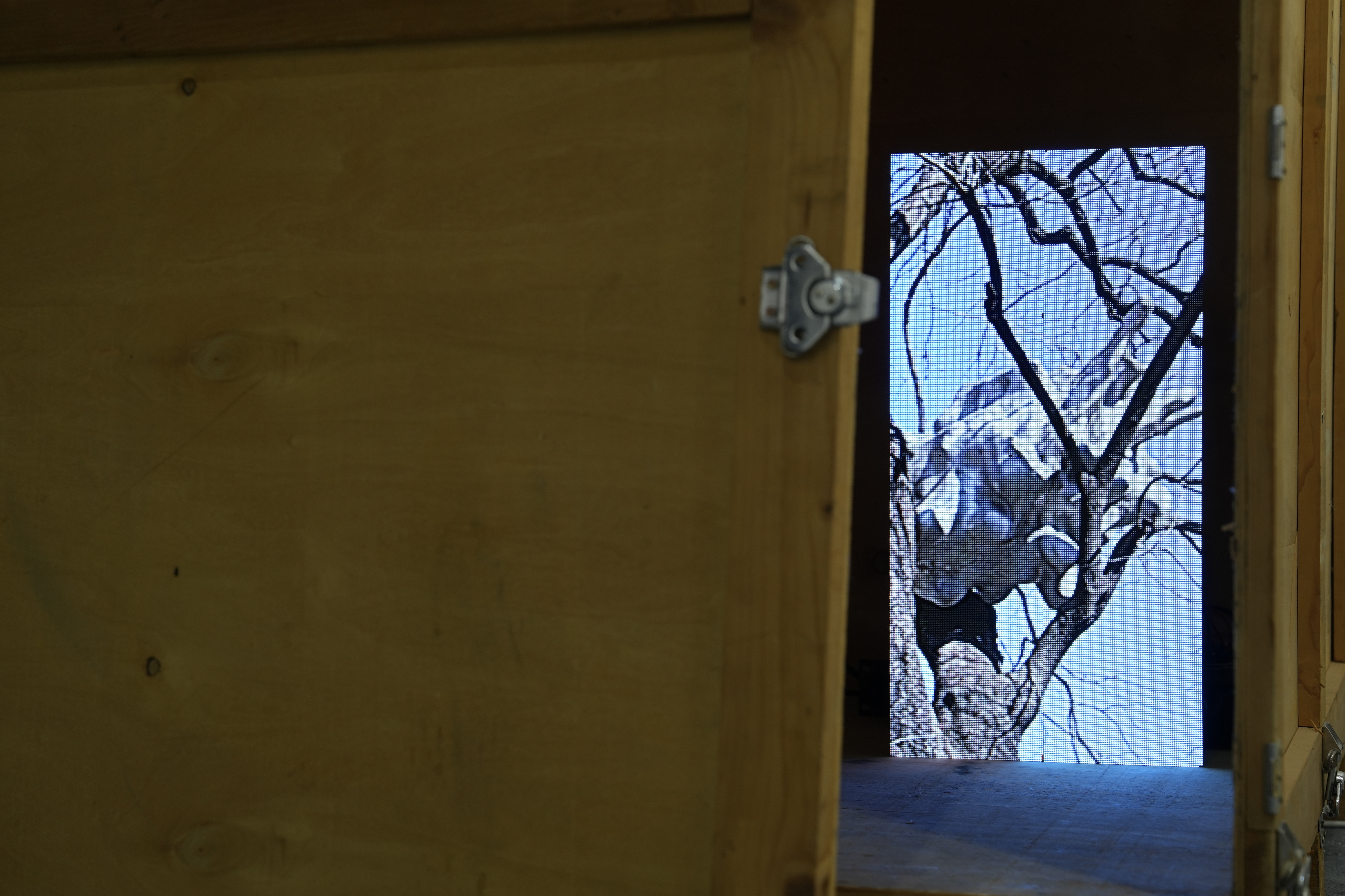 强化学习模型创造出的拒绝象形的人造物,它被放置在程序随机选中的大树枝桠上,塞入完整的生态体系。 狂风、雷电、冰雹、暴雨,无法预知的因素也许会使其坠落,当物体坠落直至接触地面的瞬间,作品完成。 带着纹章和划痕的运输木箱补充它更早些的轨迹,显示屏则诚实展现作品此刻未完成的状态。