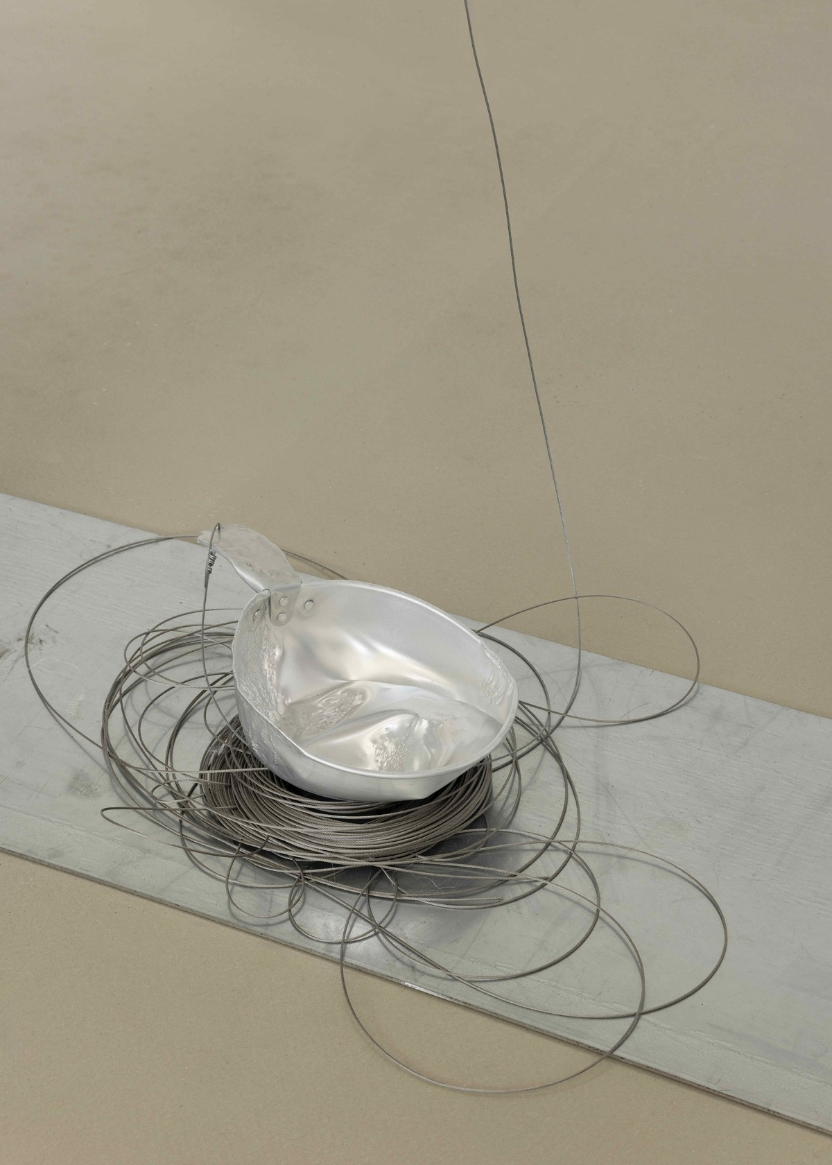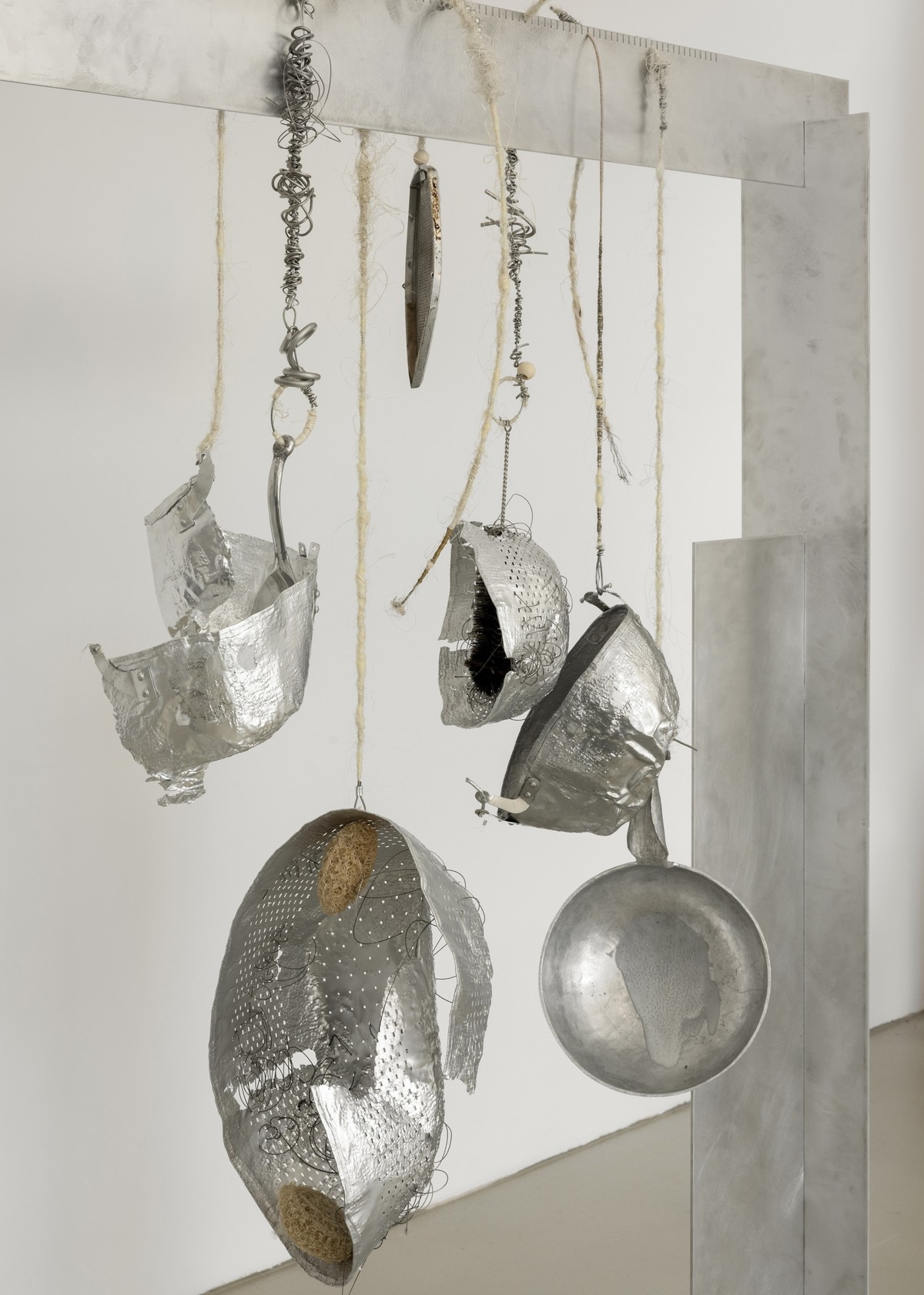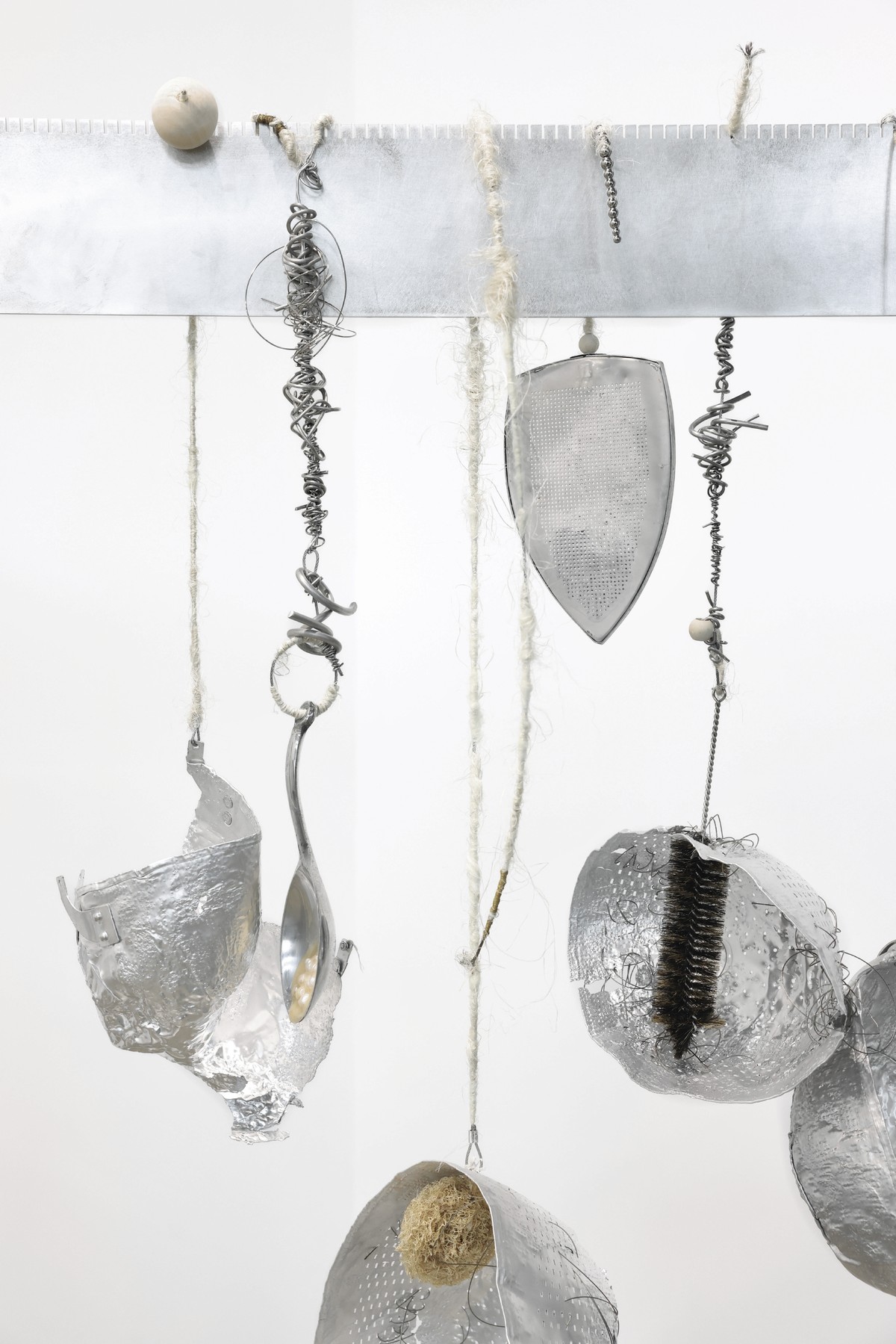 Rest is suspended against the vertical plane in a leaning posture. The artist is concerned with the body in labor and with a stillness that remains performative—“she,” though at rest, has not fully withdrawn from a state of function. With simple kitchen tools, the artist traces an organ-like body, positioning the subject in space through points, lines, and planes. In a posture that is never entirely relaxed, the work reveals the predicament of female subjectivity today.