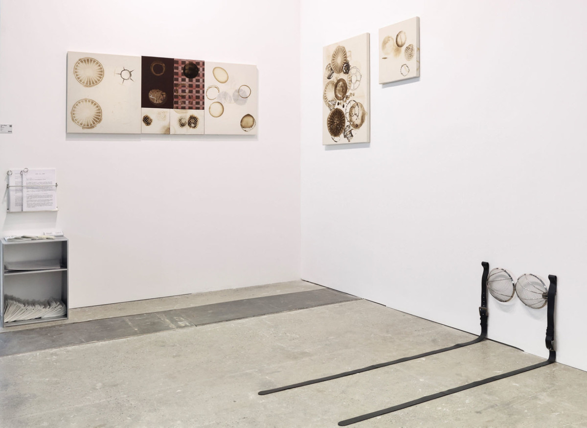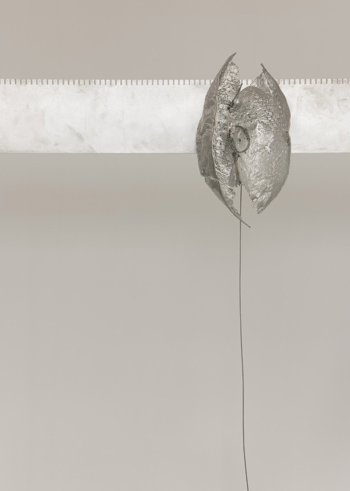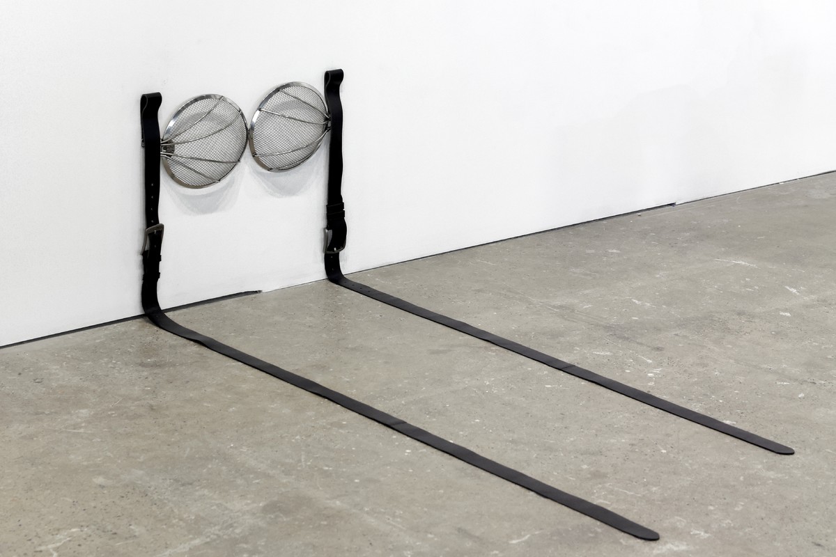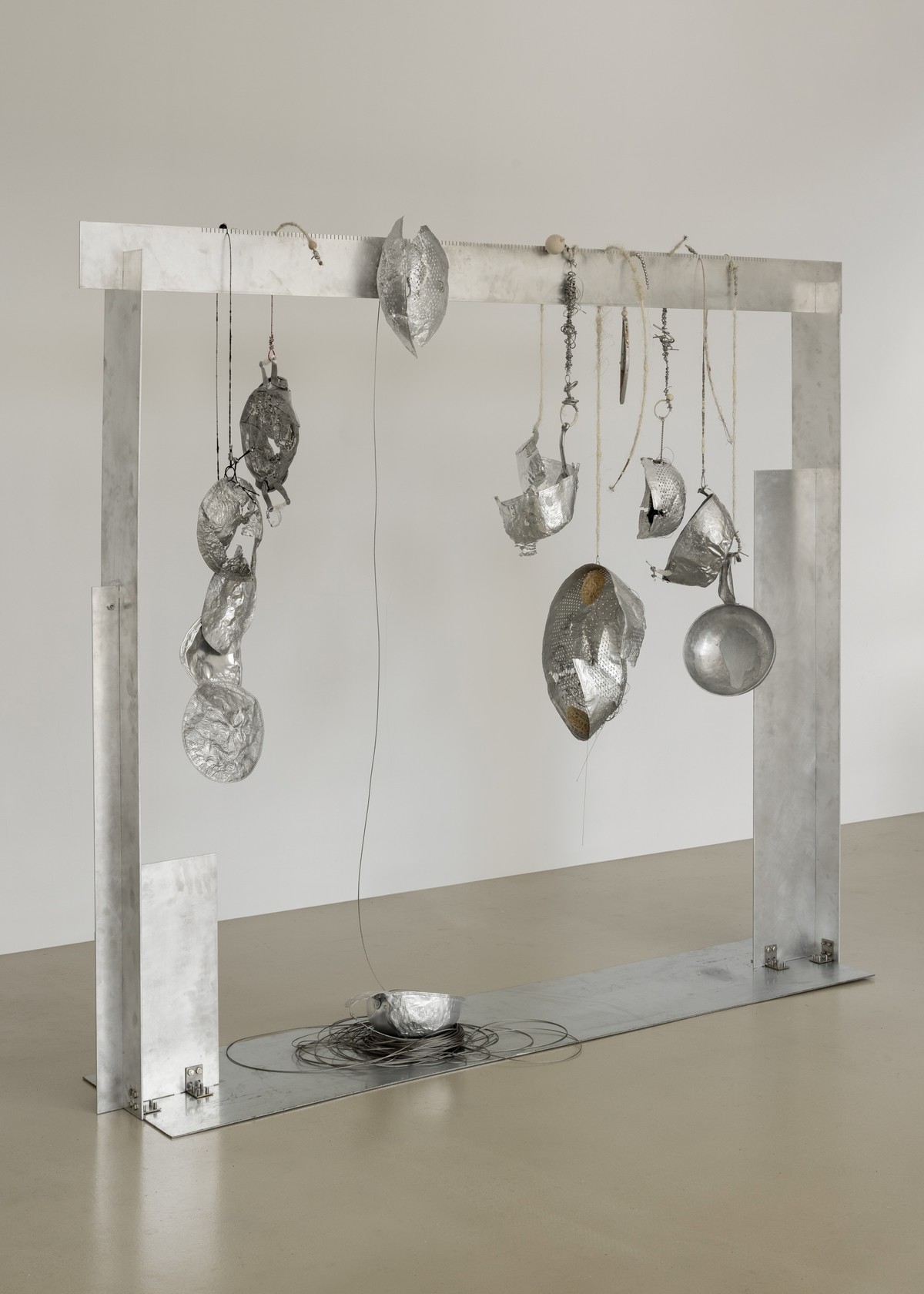 Rest is suspended against the vertical plane in a leaning posture. The artist is concerned with the body in labor and with a stillness that remains performative—“she,” though at rest, has not fully withdrawn from a state of function. With simple kitchen tools, the artist traces an organ-like body, positioning the subject in space through points, lines, and planes. In a posture that is never entirely relaxed, the work reveals the predicament of female subjectivity today.