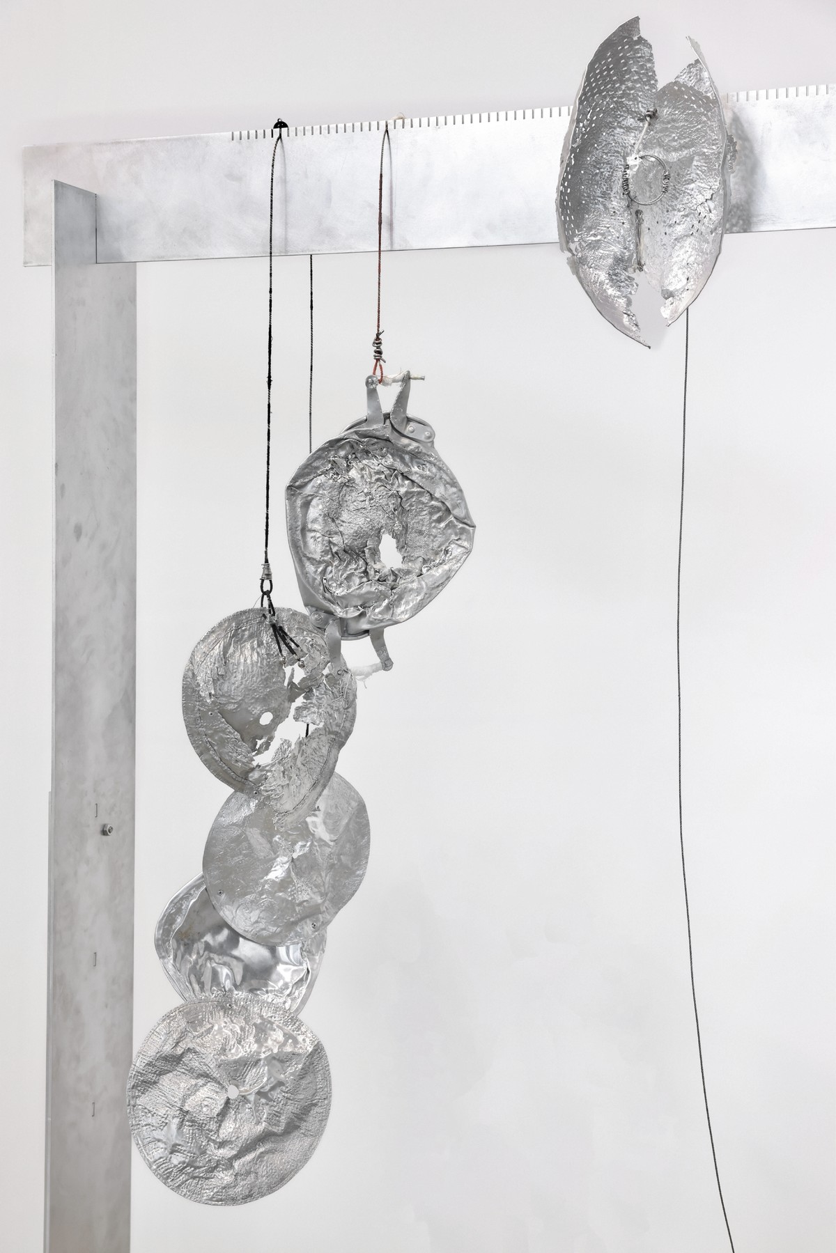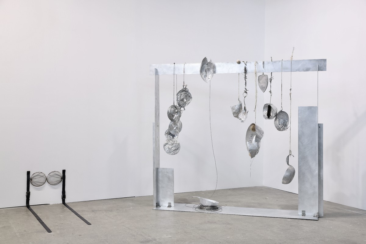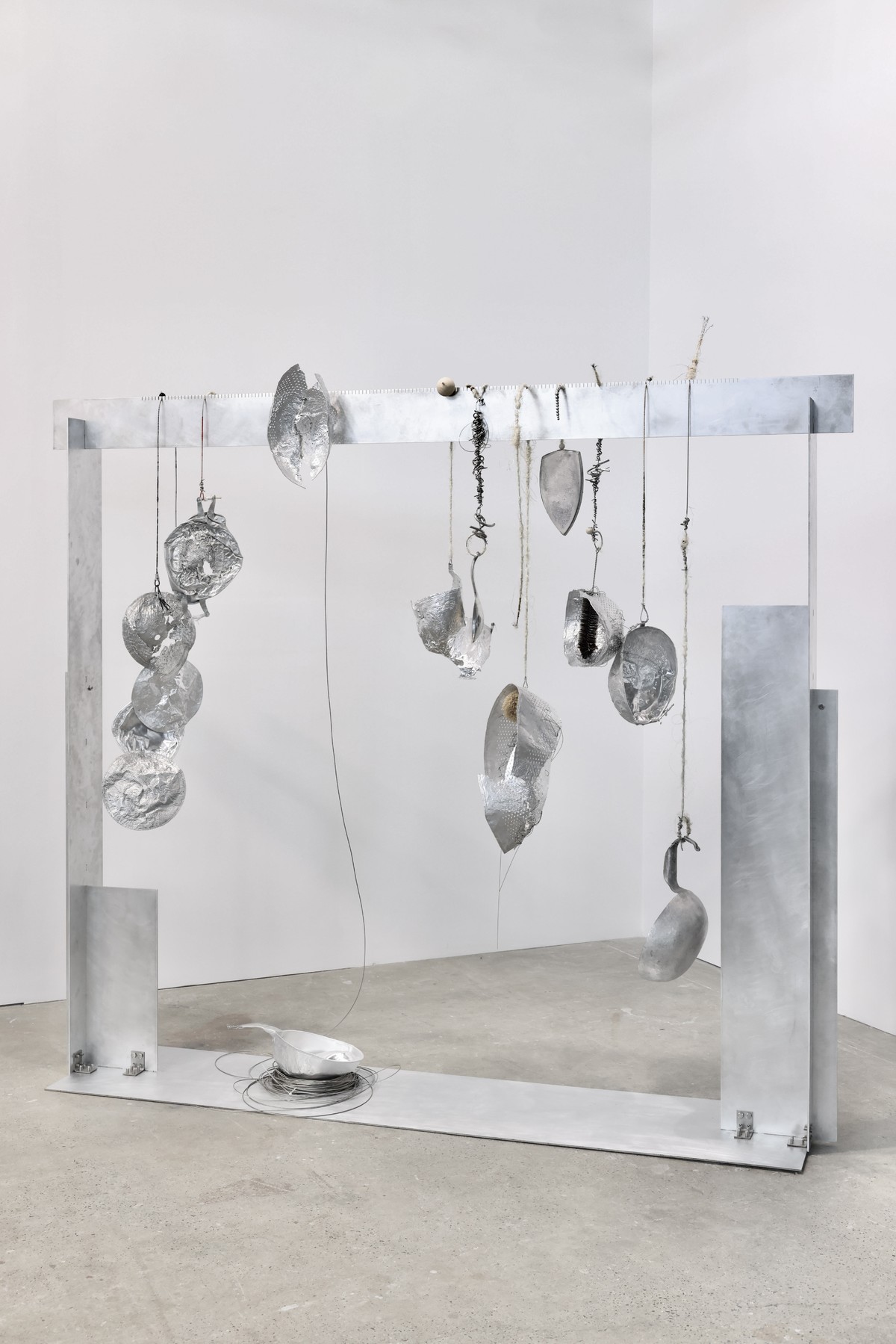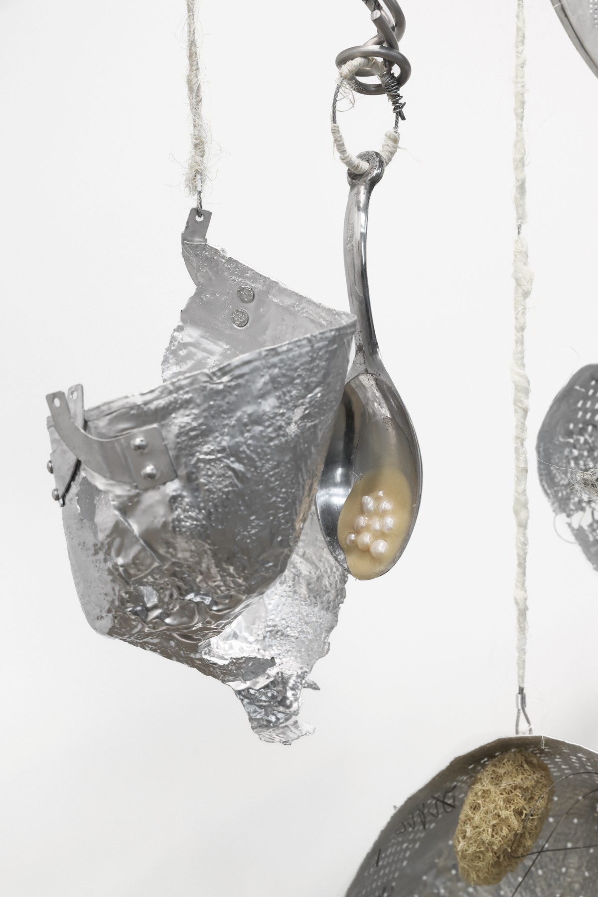 《叮!叮!咚!咚!》是一组关于厨房乱奏的叙事,运用手工制作与收集的铝质器具,通过重复性的敲击与捶打,将身体劳动的节奏转译为声音的织体。艺术家在女性主义的视角下,探索声音、劳动与日常之间的关系,以其诗性的语言讲述日常空间。