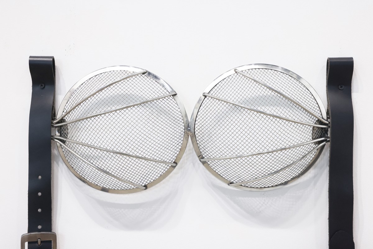 《休息》作品以倚靠的在姿态在空间立面悬置,艺术家关心的正是这样劳动中的身体与具有行为性的静止状态——“她”在休息中,又并未完全脱离功能性状态。她使用简单的厨房工具勾勒器官化的身体,通过点线面完成主体在空间的安置。在一个并非全然放松的姿势下揭示当下女性的主体困境。